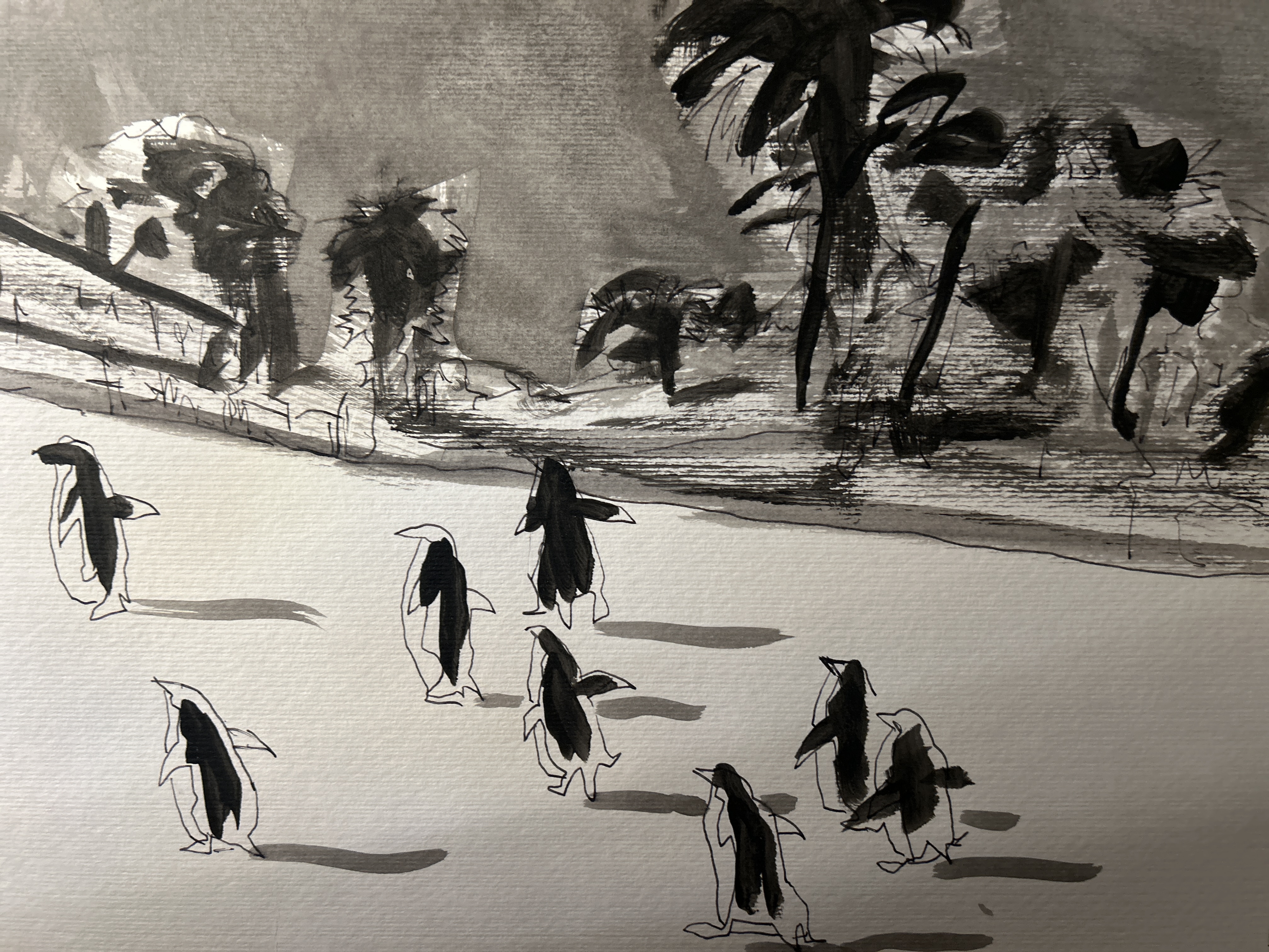 Silhouettes noires, minimalistes, presque naïves, les pingouins apparaissent dans des contextes absurdes ou décalés — notamment sur la surface lunaire. Sous une apparente légèreté se dessinent des thèmes récurrents : le groupe, la marche, l’isolement, la répétition.