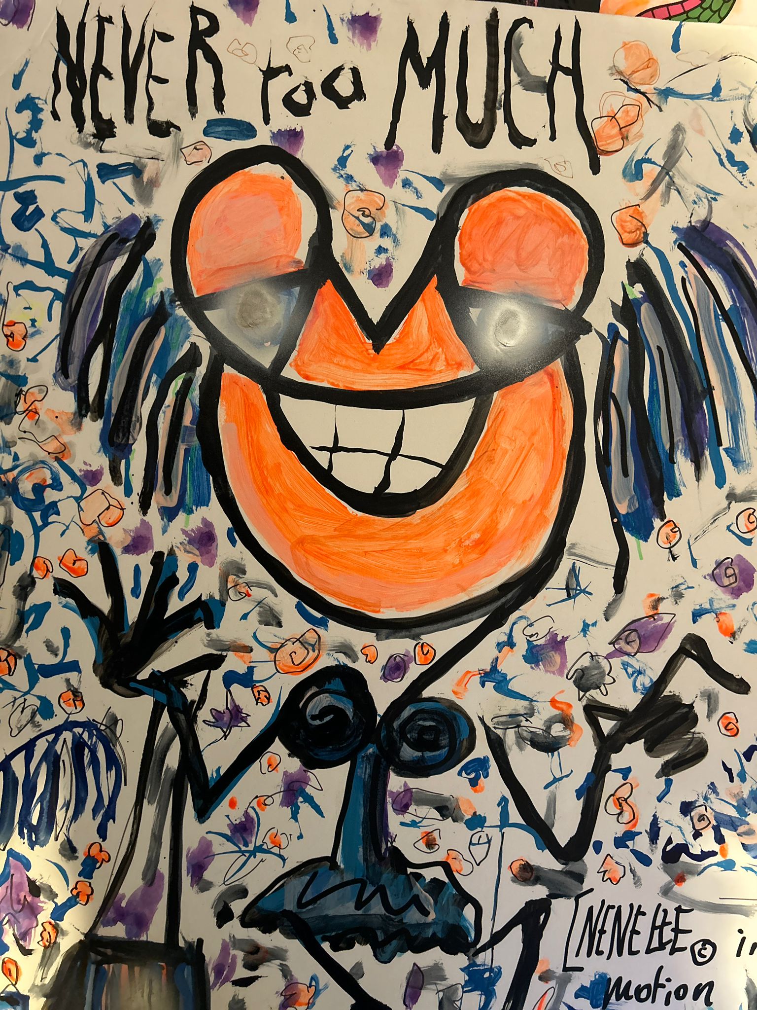 Exposition à Marbella, avec Nénette, Méderic Nebinger opère un virage plus frontal. Le visage devient central. La peinture s’épaissit, dégouline, se charge. Le trait blanc vient heurter la matière colorée.