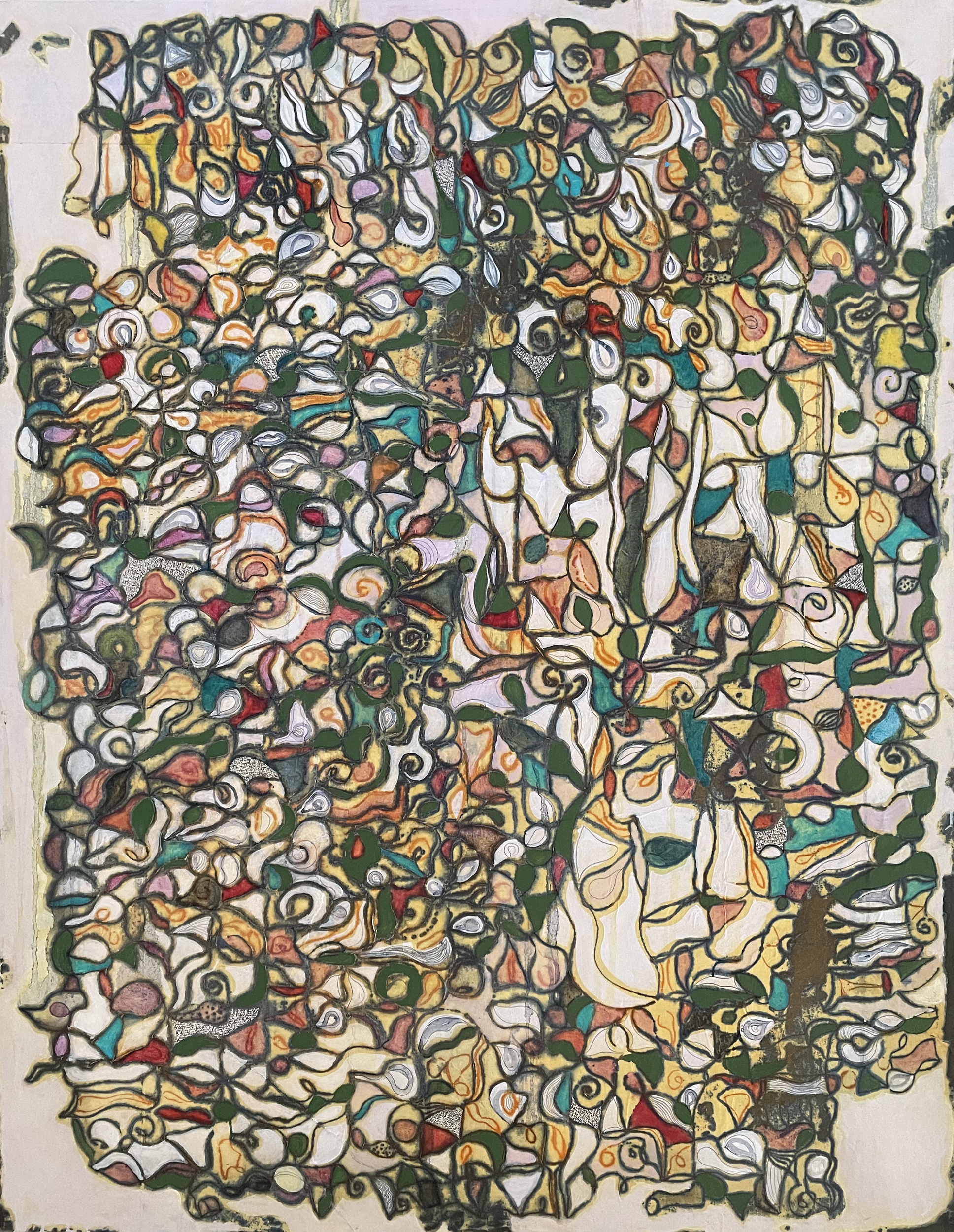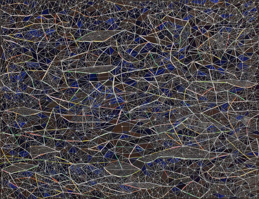 Parce qu’il y a de la profondeur, la peinture devient cartographie. Le plan n’est plus une surface neutre ou un simple support ; il se plisse, s’épaissit, se creuse. Chaque toile est traversée de strates, de rythmes, de densités variables, comme autant de reliefs invisibles. Les lignes s’entrecroisent, se superposent, s’effacent parfois, formant des réseaux de circulation plutôt que des contours figés.