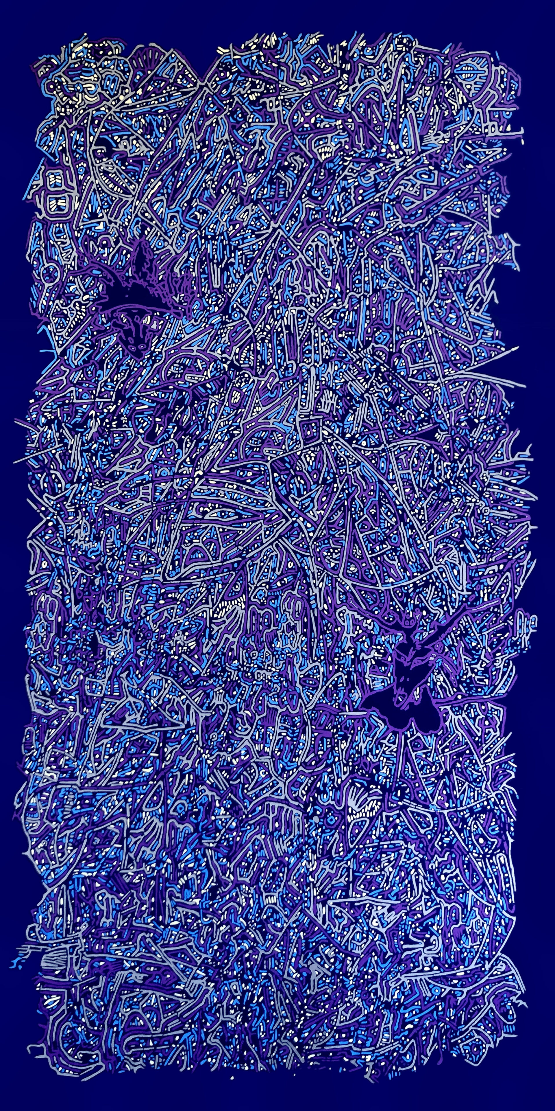 Ses œuvres semblent souvent ne montrer que des parties d’un ensemble plus vaste, dont le tout resterait inaccessible. Des structures abstraites y accueillent des surgissements figuratifs partiels, aussitôt absorbés par le flux graphique. Les motifs se répètent, se déplacent, se déforment, jusqu’à produire une sensation de décalage permanent : rien ne se fixe complètement, ni dans l’espace, ni dans le temps. Certaines lignes se prolongent jusqu’aux bords, parfois au revers même de la toile, comme si l’image refusait de se contenir dans son propre cadre.